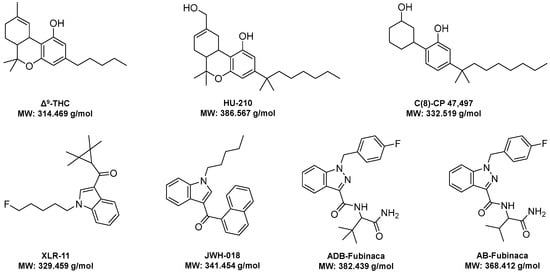 - ElSohly, M.A.; Gul, W.; Wanas, A.S.; Radwan, M.M. Synthetic cannabinoids: Analysis and metabolites. Life Sci. 2014, 97, 78–90. [Google Scholar] [CrossRef]
