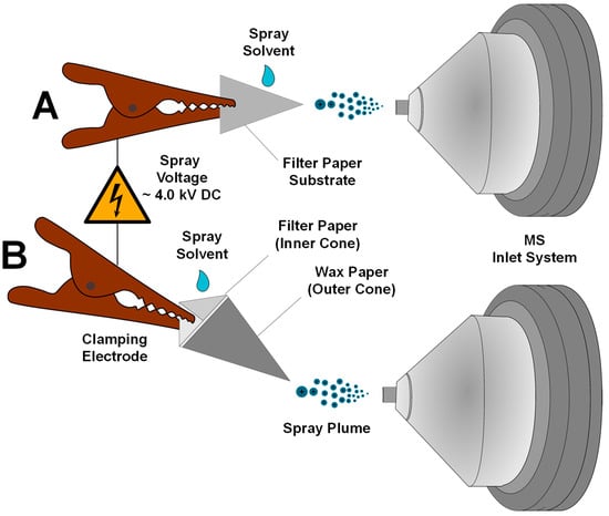 Further, completely wetting the paper substrate with the deposited spray solvent is critical, as it is the solvent bridge that allows for the conduction of a high voltage to the triangular tip to produce said Taylor cone plume. A high potential of ~4.0 kV applied via a clamping electrode generates an electric field between the triangular egress and the MS inlet, resulting in charge accumulation at the apex of the paper cone, owing to the deformation of bulk liquid (comprising both the spray solvent and extracted analytes that have properly migrated) found in this region. As this occurs, the surface of the liquid attempts to retain its original shape to minimize unfavorable energetic conditions, all while the columbic repulsive force of the accumulated charges also increases. Once this force reaches a magnitude equivalent to the surface tension of the solvent (i.e., when the Rayleigh stability limit is attained), a Taylor cone forms, thus initiating the electrospray process [53]. This causes the bulk liquid to erupt into a spray of charged droplets which undergo cycles of solvent evaporation and further columbic fission to eventually release desolvated, gas-phase analyte ions sampled via the vacuum inlet for mass analysis. This process, which occurs in ambient conditions, is partially depicted in Figure 2. As anticipated, any change to the employed solvent system can cause corresponding performance changes to any of these aspects of these mechanisms.