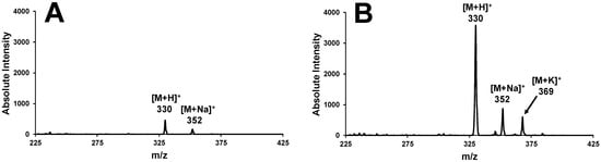 For PSI-MS analysis, MQuant chromatographic paper strips (EMD Millipore Corp., Billerica, MA, USA), pre-cut into isosceles triangles (7 mm × 5 mm × 5 mm), were used as the employed substrate, which featured a plastic backing; a complete breakdown of this ion source has been previously reported [23,30], and a mock-up can be seen in Figure 2A. The triangular tip with rigid plastic backing plays an important role in spray quality and duration during PSI-MS analysis. Each substrate was spotted with a 1 μL aliquot of stock solution of each cannabinoid under study and allowed to dry completely before analysis—this in turn produced a drug residue of known deposited mass. Each strip was both mounted and exposed to high voltage through a shielded, clamping-style electrode that in conjunction with applied solvent allowed for a plume of charged droplets to be emitted from the triangular egress of the paper. An x–y–z translational stage allowed for fine adjustment in relation to the MS inlet, position at a tip-to-inlet distance of ~3 mm. Ions were generated under ambient conditions by applying high voltage (~4.0 kV) across the triangular paper substrate after they had been saturated with a 3.0 μL aliquot of the desired spray solvent system.