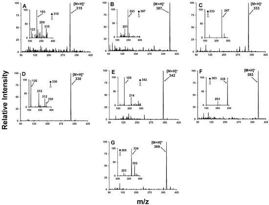 Positive-mode PSI-MS spectra generated for investigated cannabinoids, including (A) ∆9-THC, (B) HU-210, (C) (C8)-CP 47, 497, (D) XLR-11, (E) JWH-018, (F) ADB-Fubinaca, and (G) AB-Fubinaca using the optimum spray solvent systems as indicated by systematic characterization (seen in Figure 5 and Figure 6). Corresponding MS2 spectra are presented in the inset.