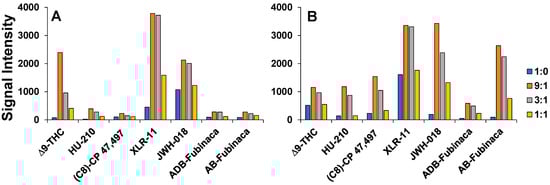 Bar chart comparison of cannabinoid analyte signal obtained via PSI-MS using various (A) MeOH:H2O and (B) ACN:H2O systems. Concentrations of organic–aqueous solvent systems are 1:0, 9:1, 3:1, 1:1, by volume, with 0.1% formic acid added to assist analyte protonation. Maximum signals obtainable are 4000.