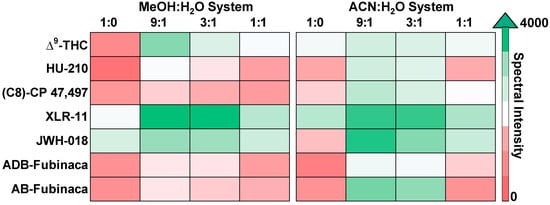 Of specific importance to this work was establishing the relative ionization efficiency of our next-generation, spray-based ion sources for cannabinoid evidence types when employing these variable spray solvent systems. For this, the ionization efficiency can be inferred from the corresponding mass spectral ion signals collected and averaged from replicate measurements from a static deposited mass of cannabinoid analyte (i.e., 100 ng deposited). PSI-MS signal intensities obtained for each cannabinoid using the target compositions (1:0, 9:1, 3:1 and 1:1, v/v) of the MeOH:H2O and ACN:H2O solvent systems acidified with formic acid (0.1%, v/v) are compared in Figure 5. Note that the maximum ion signal intensity obtained on the MS employed is 4000 arbitrary units (AU). For a better visualization, as well as to serve as quick reference guide for future method operators, heat maps were created, as seen in Figure 6. Here, the red-to-green transition corresponds to ion signal intensities ranging from 0 to 4000 AU. Across both graphs, it is apparent that the 9:1 proportion produced the highest ionization efficiency for both solvent systems. Correspondingly, this shows that the level of organic solvent is critical, but also needs to be cut with some amount of water; this is supported by the fact that the 1:0 compositions performed relatively poorly compared to the 9:1 mixtures. When comparing both spray solvent systems, the ACN:H2O compositions were the highest performing, with the 9:1 ACN:H2O w/0.1% FA producing admirable results for all cannabinoids tested. These cumulative results support the observations carried out on the authentic cannabinoid-based evidence (Figure 3).