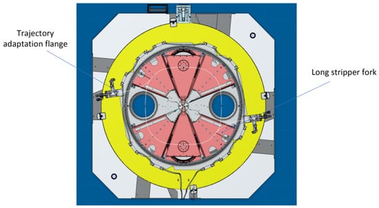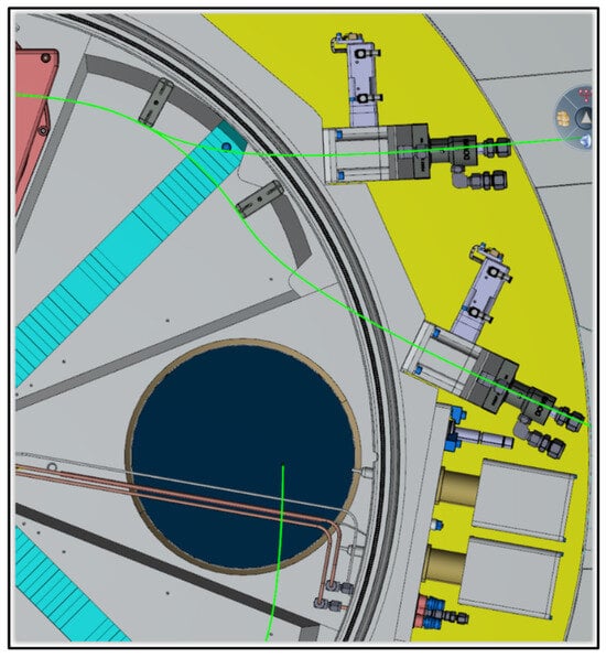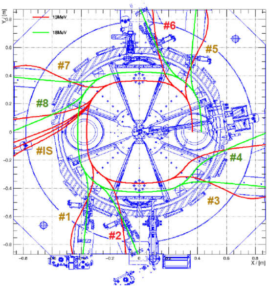 Figure 3 for the 18 and 13 MeV energy trajectories. The beam is extracted at lower energies for the eight exit ports by a ‘long shaft’ stripper fork. However, for some of the exit ports, this feature cannot be used due to the vacuum beam port position or magnetic yoke collision, as shown in