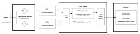 The digital spectrometer (Figure 1) is built as a modular system, allowing for the use of different types of scintillation detectors. The preamplifier splits the signal from the detector into two branches. Each branch is differently amplified and digitized by a separate ADC. Different amplification increases the dynamic range of particles that the spectrometer is able to process.