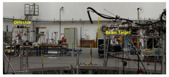 The experimental arrangement in the low-scatter hall of PTB laboratory. Position of the detector (on the (left)-side) and the beam target (on the (right)-side) as used for the measurements.