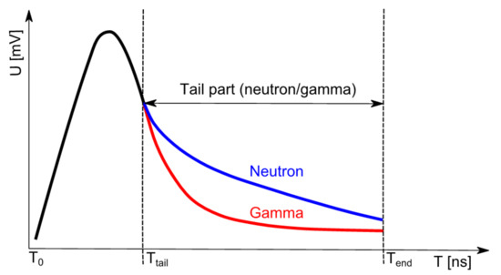 where T0 corresponds to the beginning of the pulse, Ttail is an optimized beginning of the tail part of the pulse and Tend is an optimized end point of the pulse (see Figure 5). The optimized PSD parameters for the p-Terphenyl scintillator were set the same for all performed experiments, i.e., Ttail = 16 ns and Tend = 96 ns.