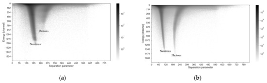 The pulse-shape discrimination capability of the p-Terphenyl scintillator coupled to the fast digital spectrometer has been evaluated for selected energy of 14 MeV. We carried out the same measurement with the equivalent NE-213 detector. We studied the PSD capability (see Equation (1)) for each measured detector. Two-dimensional graphs have been created (see Figure 6).