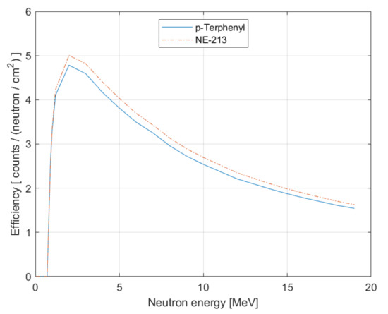 For neutron energies of less than 1 MeV, the p-Terphenyl scintillator has a slightly higher efficiency, no more than 4%, compared to the NE-213 detector. On the contrary, at higher neutron energies, the efficiency of the NE-213 detector is higher by up to 6%.