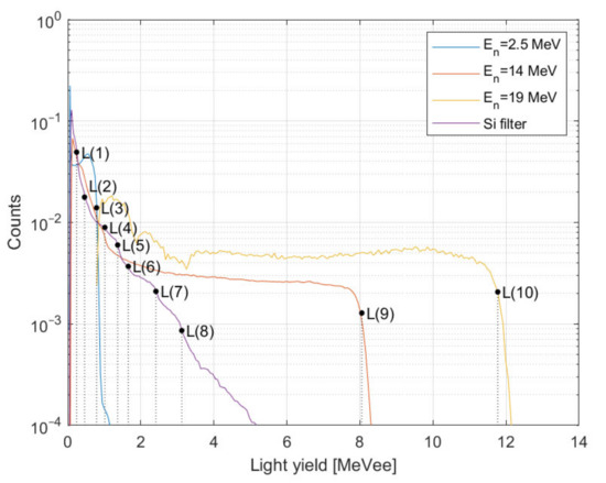 The normalized light-yield spectra for p-Therphenyl scintillator. The proton edges are labeled L(1) … L(10), the numerical values are listed in Table 3.