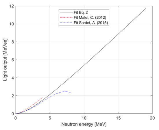 We compared our results with previously presented results of light output functions (see Figure 10). Our light output function was determined in the wide energy range (1.1–19) MeV. The results reported in study [1] are higher in comparison with our values, and, conversely, our values are higher than the results stated in study [2] for energies less than 8 MeV. The main contribution of our work is the overall refinement of the light output function for the p-Therphenyl scintillator.