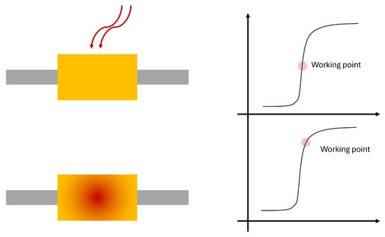 Working principle of a Transition Edge Sensor. An event (e.g., photon/phonon absorption) heats the superconductor, moving its temperature from the ideal working point (center of the normal to superconducting transition).