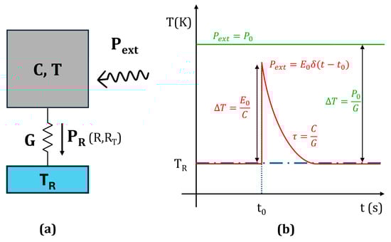 Working principle of a TES not in electro-thermal feedback. (a) The thermal scheme of a TES with temperature and heat capacity C, the weak thermal link to the reservoir through a thermal conductance G and the external power and power exchanged to the reservoir . (b) Solution to Equation (17) of the TES as a function of time in the two aforementioned cases.