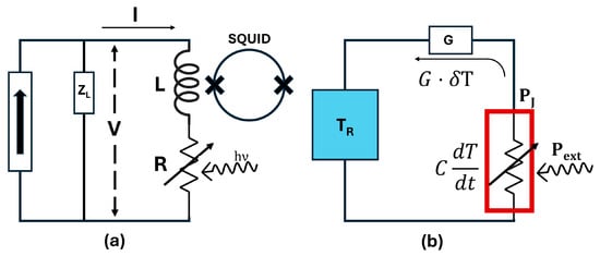 The schematic of a TES biased in negative electro-thermal feedback. (a) Electric scheme of a TES and (b) thermal scheme of a TES. Both schemes contribute to the coupled differential equations in Equation (18).
