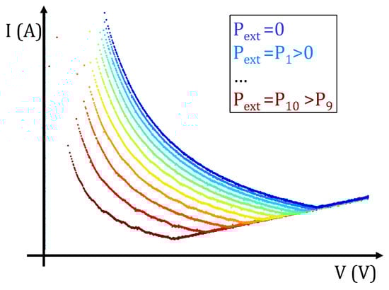 Measured I–V curves of a TES. The I–V characteristic of a TES can be derived as the steady-state solution of Equation (18). The top most blue curve represents the case in which no optical load heats up the TES, whereas all the other curves represent increasing values of as described in the legend.