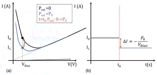 Operation of a TES in a bolometric regime. (a) Two I–V curves relative to (black) and (blue). At time , the external power is turned on and the TES, biased with a voltage , rapidly transitions from one I–V curve to the other, resulting in a different current flowing through the superconductor. (b) Response of the TES to the scenario described in (a) but represented as a function of time.