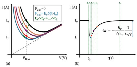 Operation of a TES in a calorimetric regime. (a) At time , the external power is turned on and the TES for an infinitely small amount of time; the TES biased with voltage rapidly transitions from one I–V curve to another and back to the original curve as described by the green arrows. This results in a time-varying current flowing through the superconductor. (b) Response of the TES to the scenario described in (a) but represented as a function of time.