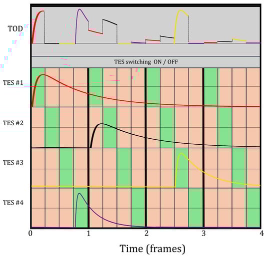 To reiterate, when a deposition of energy occurs onto the TES, its temperature increases and so does its resistance. If biased correctly in an NETF scheme, this results in an increased current flowing through the TES (according to the I–V curves shown in Figure 6), which can be further amplified and read out. The main difference between the two operational regimes is the nature of the impinging power: if it is transferred to the TES (or its absorber) instantaneously or with a time-scale which is much faster than the characteristic time-scale of the TES response in NETF, it is said to be operated as a calorimeter (single photon/particle detector). Differently, if the power is delivered to the TES in a time-scale which is comparable or even larger (imagine an optical flux or the variations thereof) than the characteristic time-scale of the TES in NETF, the TES is said to be operated as a bolometer. From a purely physical point of view, there is not a large difference other than the functional dependency of in Equation (18). Figure 6a,b show the operation of a TES as a bolometer (See Section 3.2), whereas Figure 7a,b show the operation of a TES as a calorimeter (See Section 3.3).