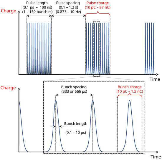 A schematic of the beam structure at CLEAR. In both subplots, the y-axis represents the charge while the x-axis represents the time. For the bottom subplot, the time range is much smaller, allowing us to better visualise the beam-train substructure [13].