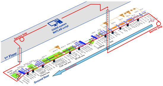 A schematic of the fibre installation at CLEAR. Due to the positioning of the readout electronics in the gallery above the accelerator, a 130 m fibre is necessary to cover the 40 m beam line.