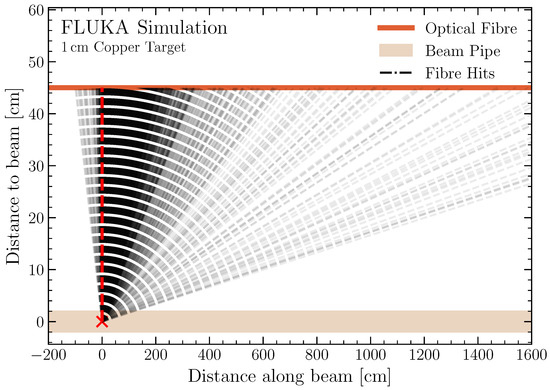 The simulations were run with 2.5 million primary electrons which create, on average, 1.5 secondary charged particles per primary with velocities above the threshold needed to generate Cherenkov radiation within the fibre. The loss-shower distribution is visualised in Figure 3. Each of the dashed black lines visualises a particle hitting the fibre. For this setup with a distance between the fibre and the beam axis of 45 cm, 95% of fibre hits occur in the range −0.3 m to 4.7 m relative to the copper block; the maximum is located at 50 cm. Nevertheless, in this simulation run, 1% of fibre hits occur more than 15 m downstream of the copper block position.