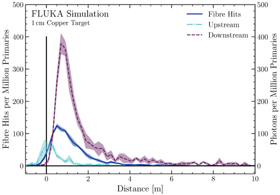 A custom user routine was written to save the particle trajectories of the small fraction of the secondary particles which traverse the optical fibre. Furthermore, a python script was then used to convert these trajectories into the number of generated and captured Cherenkov photons in a wavelength range of 200 nm to 900 nm. Photons within the fibre only undergo total reflection, and therefore transport, within a certain angular range, depending on the numeric aperture of the fibre. As the angle under which charged particles emit Cherenkov photons is a function of velocity, only secondary particles traversing the fibre at certain angle–velocity combinations emit capturable photons [8,22]. For this fibre with a numeric aperture of 0.22, particles traversing the fibre at effectively the speed of light in vacuum in an angular range of 39° to 55° have a chance to emit captured photons in one direction. For further details on the simulations, the reader is referred to [9]. The number of fibre hits and captured photons as a function of distance along the beam trajectory to the impact point on the copper block is given in Figure 4.