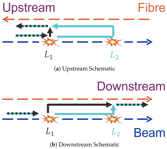 However, it can be easier to resolve signals from different loss locations when using the upstream waveform. This can be best visualised by investigating the signal paths from two loss positions and with a certain distance , as shown in Figure 5. At the upstream detector, the loss signal from will arrive slightly after the loss signal from with the difference in arrival time between these two signals consisting of two parts. The first part corresponds to the time that the beam needs to cover the distance between the two loss locations. The second part corresponds to the time that the photons need to propagate along the fibre from the second loss location back to the first. Approximating the speed of the beam with the speed of light in vacuum, c, and the speed of light in the fibre with a refractive index , this gives:
