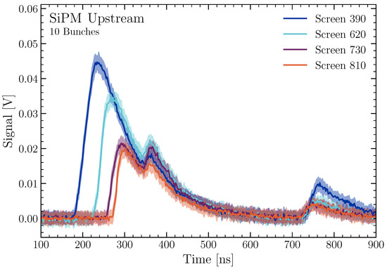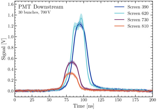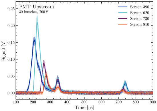 In Figure 6 and Figure 7, mean example waveforms are shown for losses created by thirty bunches for the upstream and downstream ends respectively, measured with a PMT at 700 V. In these figures, the variance between different signals is visualised by the transparent band. The different time and signal scales between the figures is to be noted with the downstream signals being notably higher but closer in time, as expected from previous considerations.