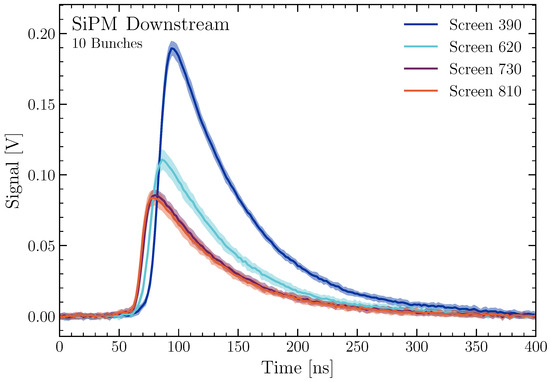 A plot showing the measured downstream waveforms, read out with a SiPM at 43 V for loss signals created by a 10 bunch beam. The time in nanoseconds is shown on the x-axis, with the signal in volts on the y-axis. To visualise statistical fluctuations, the standard deviation on the waveforms are given by the transparent bands.