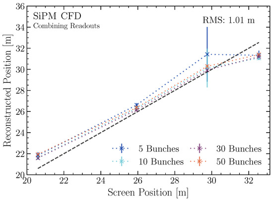 To quantify the accuracy of the multitude of combinations between the photon detector (SiPM or PMT), fibre readout side (up- or downstream or combined) and signal-to-timestamp conversion (peak position, constant threshold or CFD), the loss waveforms measured at the four screens and for the four different numbers of bunches were converted into longitudinal positions for all combinations. To compute these loss position values and their uncertainties, the mean and standard deviation from the 20 measured waveforms, i.e., the 20 shot-by-shot loss measurements, were used. This gives sixteen values with uncertainties for each of the nine possible readout-conversion combinations for both the SiPMs and the PMTs.