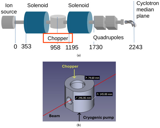(a) Schematic representing the elements composing the injection line. (b) The design of the diagnostic chamber located 958 mm from the source output. In the picture, there are also the principal dimensions and the foreseen location of the chopper and cryogenic pump.
