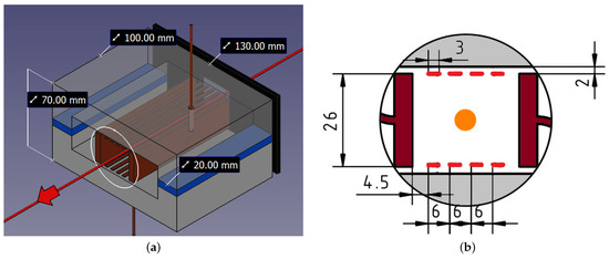 (a) The final configuration of the chopper system: the permanent magnets are in blue, the iron yoke in gray, the electrodes in brown, and one of the two masks is in black (the other, on the opposite side, is hidden). The red line represents the H− beam trajectory while the white circle is the border of the section depicted in (b). In this second picture, the two main electrodes are in brown, the sub-electrodes in red, the yoke is gray and the orange dot is the H− beam position. All the distances are in mm.