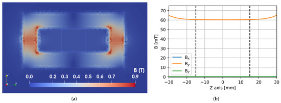 The resulting magnetic flux density in the transverse direction is shown in Figure 4a,b. The plot indicates that the magnetic flux density is vertical (with negligible components in other directions) and fairly uniform within the region of interest, i.e., between the two electrodes, which are positioned 15 mm from the beam axis. The magnetic flux density at the center is 0.06 T.