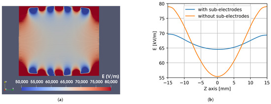 The results are illustrated in Figure 5. The contour plot in (a) represents the electric field magnitude on the transversal plane: the effect of the eight sub-electrodes is clearly visible. In (b) there is a comparison between the Z component of the electric field taken along the axis connecting the center of the two main electrodes: the blue line represents the chopper with the sub-electrodes while the orange line is the case of a chopper without them.