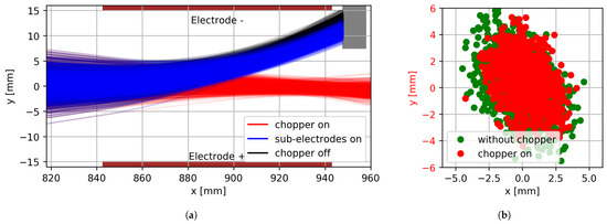 The simulated beam, characterized by measured parameters, consists of 103 particles. The outcomes of the dynamics integration are illustrated in Figure 6. In panel (a), the beam interaction with the dumper (represented as a brown box) is depicted. The beam stops on the dumper when the chopper electrodes are fully deactivated (black lines) and when the sub-electrodes are maintained at their operational voltages (blue lines). These two conditions are related to alternative configurations of the chopper, as explained in Section 5. In both scenarios, the beam is entirely stopped by the dumper.