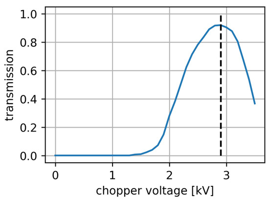 The transmission of the H− beam after the inflector as a function of the chopper voltage. The best transmission voltage, equal to 2.9 kV, is indicated by the dashed black line.
