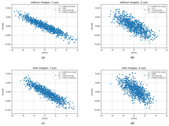 The emittances at the inflector entrance with the chopper removed (panels (a,b)) and with the chopper activated at its optimal voltage (panels (c,d)).