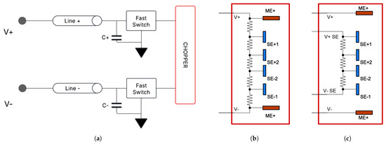 Simplified electric circuits representing the device are illustrated in Figure 9a,b. They are implemented, with more details, in LTspice 24.1 [21] in order to verify their behavior. In Figure 9a, there are the connections, one for the positive bias and another for the negative bias, from the power supplies to the fast switches [22] (which should be installed as close as possible to the chopper) and from there to the chopper. Just before the fast switches, there is a capacitor to ensure a rapid rise in the voltages of the main electrodes. A capacitance of 100 nF is considered a suitable value.