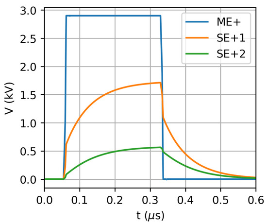 In Figure 10, three curves represent the voltages for the positive electrodes during a single pulse, with a voltage divider resistance equal to 15 k and a duty period of 250 ns. The plot shows that the main electrode (blue line) reaches its final voltage in a very short interval (less than 1 ns) compared to the two sub-electrodes (orange and green lines).