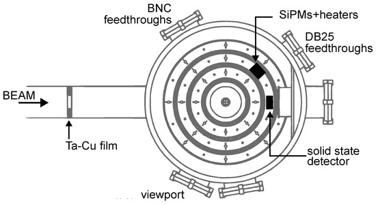 Irradiation chamber at the EDRA facility. The proton beam enters the chamber after passing through a 72 µm-thick tantalum–copper (Ta–Cu) attenuator, designed to regulate energy deposition and flux intensity. Electrical connections are introduced into the chamber via a DB25 feedthrough port. A remotely controlled concentric ring system at the chamber base allows precise target positioning, enabling selection between a solid-state detector and the SiPM–heater assembly for irradiation experiments under controlled conditions.