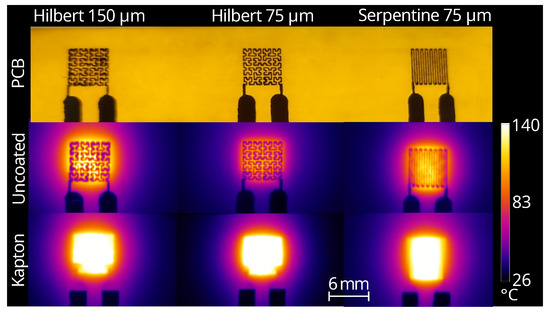 The evaluated heater designs are based on two distinct geometries: a serpentine pattern [28] and a Hilbert curve [29,30]. The serpentine heater and one of the Hilbert designs were manufactured with a wire width of 75 µm, while an additional Hilbert variant was designed with a wider pitch of 150 µm.