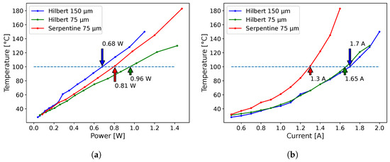 A qualitative assessment of the heat distribution uniformity was conducted using thermographic imaging (Figure 2). After a 50 µm thick layer of Kapton tape was applied, improved thermal uniformity was observed in the serpentine structure, as the pad corners in the Hilbert curve design exhibited uneven heat distribution. The power consumption of each heater depends on the trace resistance, which can be adjusted by modifying the trace width and length. The complete power and current consumption profiles as a function of temperature are shown in Figure 3a and Figure 3b, respectively. These profiles illustrate the measured electrical requirements to reach the target temperature of 100 °C for each heater design. Specifically, the figure shows that the serpentine design exhibits the lowest current requirement to reach 100 °C, while the 150 µm Hilbert geometry achieves the lowest power dissipation at the same target temperature, but with a 30% higher current. The power scales accordingly, and the difference in power is due to the difference in resistance between designs.