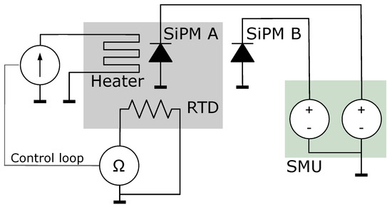 Schematic of the experimental setup. Two SiPMs were simultaneously irradiated inside the chamber. One SiPM was equipped with a heater integrated into the pads to facilitate the annealing process after each cycle. That SiPM’s temperature was monitored by measuring the resistance of an attached Resistance Temperature Detector (RTD). A current source, managed by a PID controller, powered the heater to stabilize the temperature at 100 °C during annealing. Both SiPMs were biased using a source measure unit (SMU), which also recorded the resulting currents.