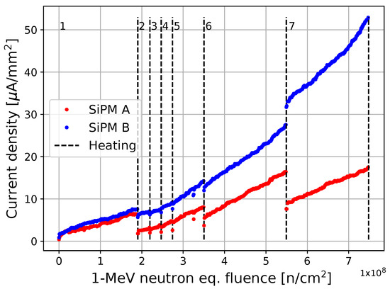 Cumulative fluence throughout the irradiation process for SiPM A and SiPM B. The dotted vertical lines indicate the thermal cycling periods applied to SiPM A, while SiPM B remains as a control without thermal treatment. A progressive reduction in dark current is observed in SiPM A following each thermal annealing cycle, suggesting a partial recovery effect induced by temperature. The temperature of SiPM A remained approximately 27 °C, except during cycle 6, when it was around 28 °C, and in cycle 7, when it was around 30 °C.