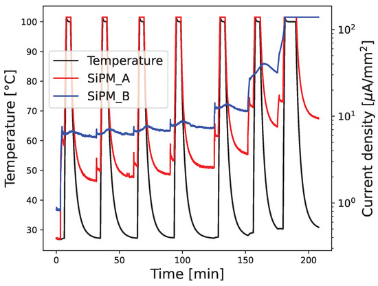 Figure 6 shows the continuous dark-current measurement at a fixed bias of 30 V, along with the temperature of sensor A recorded throughout the experiment. The plot highlights both the irradiation periods and the thermal cycles. Owing to the intrinsic dependence of dark current on temperature, an increase in the dark current of SiPM A is observed when the heater is activated, reaching the compliance limit. A slight increase in the dark current of SiPM B is also observed, likely caused by thermal coupling between the sensors.
