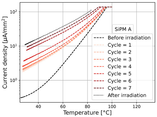 The behavior of SiPM A following each thermal annealing cycle was analyzed. Figure 7 presents the dark-current measurements for SiPM A at different temperatures, including values before irradiation, after each irradiation cycle, and one month after irradiation. The fundamental operating behavior of the sensor remained unaffected by radiation exposure. While the dark current increased due to radiation-induced degradation, the sensor continued responding as expected, exhibiting the characteristic increase in dark current with rising temperature.