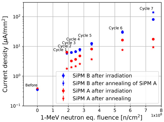For the control sample (SiPM B), which did not undergo significant thermal annealing, the radiation-induced degradation is shown in Figure 8. This device showed a progressive increase in dark current. After each thermal annealing step of SiPM A, a slight current reduction was observed in SiPM B. This effect could be explained by thermal coupling between the two devices. Nonetheless, in cycles 6 and 7, SiPM B exhibited a constant increase in dark current even when outside the periods of irradiation and heating of SiPM A. This behavior continued until the SiPM reached the current limit and stopped working. Figure 8 also illustrates the recovery behavior of SiPM A after each annealing cycle, in comparison with the corresponding current evolution of SiPM B throughout the irradiation sequence. The results show a consistent and pronounced decrease in SiPM A’s dark current after each thermal cycle, confirming the effectiveness of the applied annealing procedure.