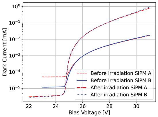 The breakdown voltage (VB) was analyzed before and after irradiation to assess potential radiation-induced changes. This parameter was estimated by measuring the dark current as a function of bias voltage at room temperature (25–26 °C). The results are presented in Figure 9. No significant differences were observed in VB between pre- and post-irradiation conditions. Prior to irradiation, the breakdown voltage was measured as (24.63 ± 0.16) V for SiPM A and (24.47 ± 0.16) V for SiPM B. After irradiation, both sensors exhibited a breakdown voltage of (24.64 ± 0.09) V, indicating that irradiation did not significantly alter this parameter. The value of VB was determined using the second derivative method applied to the dark-current curve, following the approach described in [35], and the error bars were defined based on the voltage step size used in the measured I–V curves. The pre-irradiation measurements were performed in a custom-built vacuum chamber. A leakage current affecting some of the measurement channels used for the pre-irradiation SiPM I–V curves was identified a posteriori. This additional current (approximately 50 nA for SiPM A and 10 nA for SiPM B) is attributed to that leakage, and this offset current is small enough that it does not affect the determination of . Measuring the breakdown voltage under vacuum conditions was essential to replicate the irradiation environment of the SiPMs. The post-irradiation I–V curves were measured in situ within the irradiation vacuum chamber (these were performed one month after irradiation, during which both devices remained at room temperature), and so no leakage current was observed in these measurements.