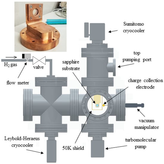 The substrate is mounted on a holder machined from a high-thermal conductivity oxygen-free copper plate (see the inset of Figure 1) cooled to approximately 2.9 K using a two-stage helium pulse tube cryocooler (Sumitomo RP62B, Sumitomo Heavy Industries, Ltd., Tokyo, Japan). A calibrated silicon diode temperature sensor monitors the copper plate temperature near the sapphire substrate. The cold head of the cryocooler is enclosed in a copper shield at 50 K and covered with multiple layers of Mylar foil to reduce radiation heating.