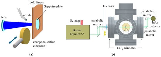 In addition to the UV laser system for photoelectron extraction, we use a Fourier transform interferometer (Bruker model Equinox 55, Bruker Corporation, Billerica, MA, USA) with a near-infrared light source (Thorlabs model SLS202L/M, Thorlabs, Inc., Newton, NJ, USA) to measure the infrared absorption spectrum of the p-H2 matrix [5]. Two gold-coated parabolic mirrors at the entrance and exit of the vacuum chamber focus and collimate the infrared beam transmitted through the sapphire substrate and p-H2 crystal, as shown in Figure 2a. After the collimating paraboloid, the beam is focused by another mirror and collected by an infrared detector (Hamamatsu model P7163, Hamamatsu Photonics K.K., Hamamatsu City, Japan).