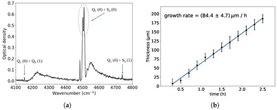 (a) Optical density spectrum of a solid p-H2 crystal after 2.5 h of growth. The absorption range used for calculating the crystal thickness is indicated by the dashed oval shape. The other two absorption features, indicated by arrows, are used to determine the ortho-hydrogen fraction. The notation used to indicate the different transitions is explained in [9]. (b) Measured crystal thickness as a function of time: the growth process is linear and begins with a delay of about 20 min following the start of the p-H2 gas flux at t = 0.